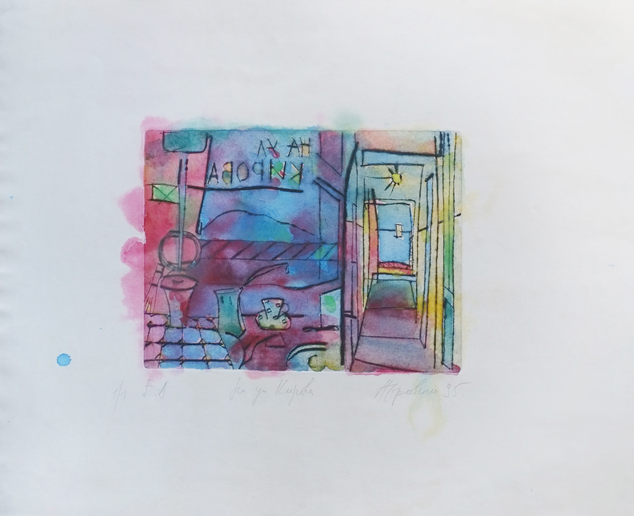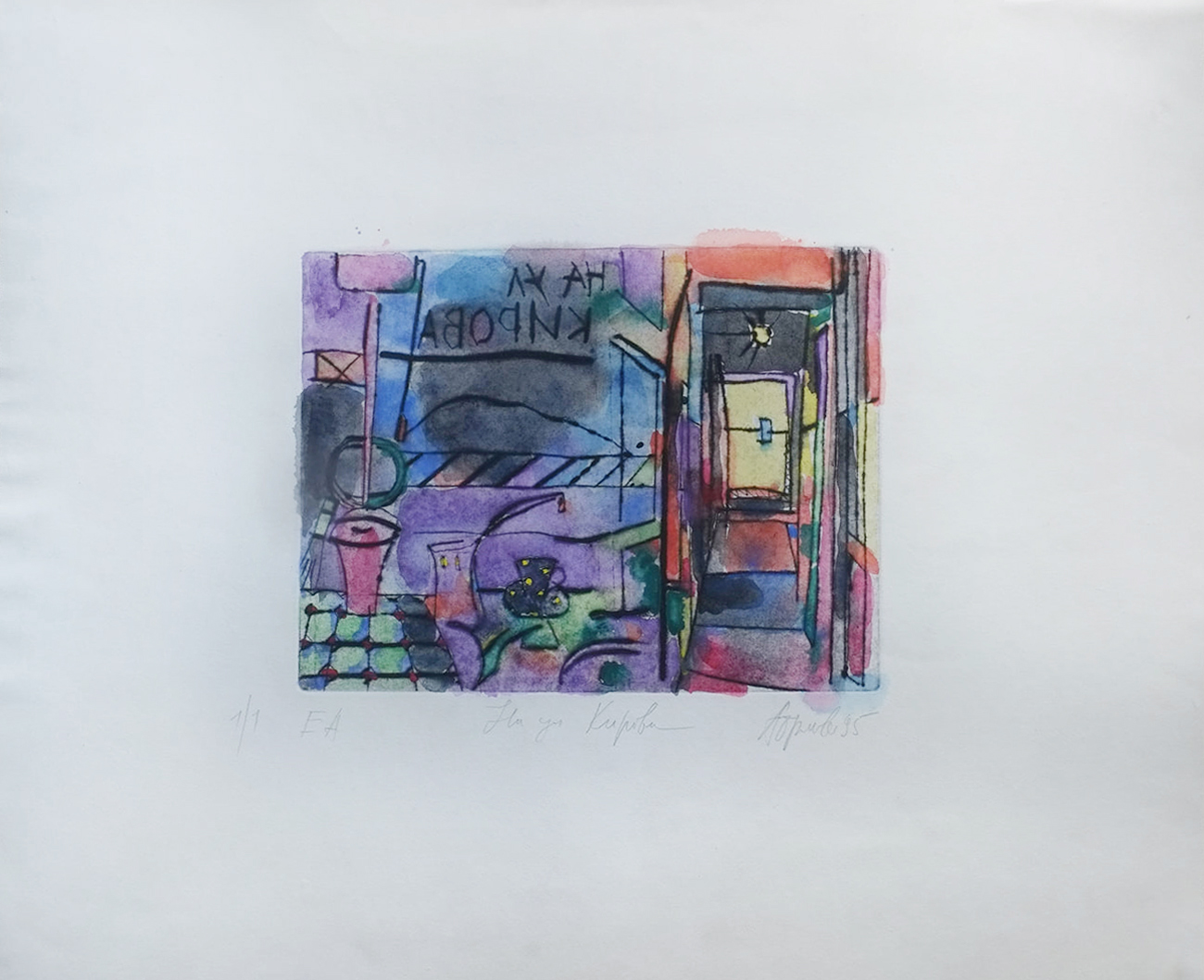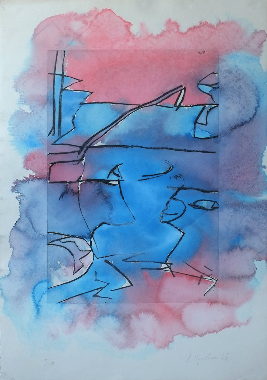 Гравюры 1995 г. Натюрморт. Точнее, фрагмент натюрморта. Приехав с утра к родителям на ул. Кирова (где у меня была мастерская), я зашел в комнату и увидел на столе: турку (джезва), чашку на блюдце, на доске хлеб, чайную ложку, нож, сахарницу, масло в масленке, скорлупу от яйца... Это был обычный мамин завтрак, а её и след простыл... убежала на работу.