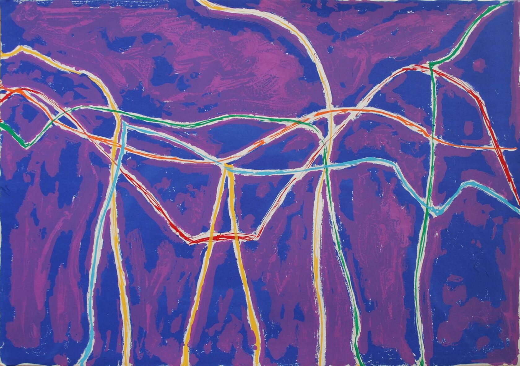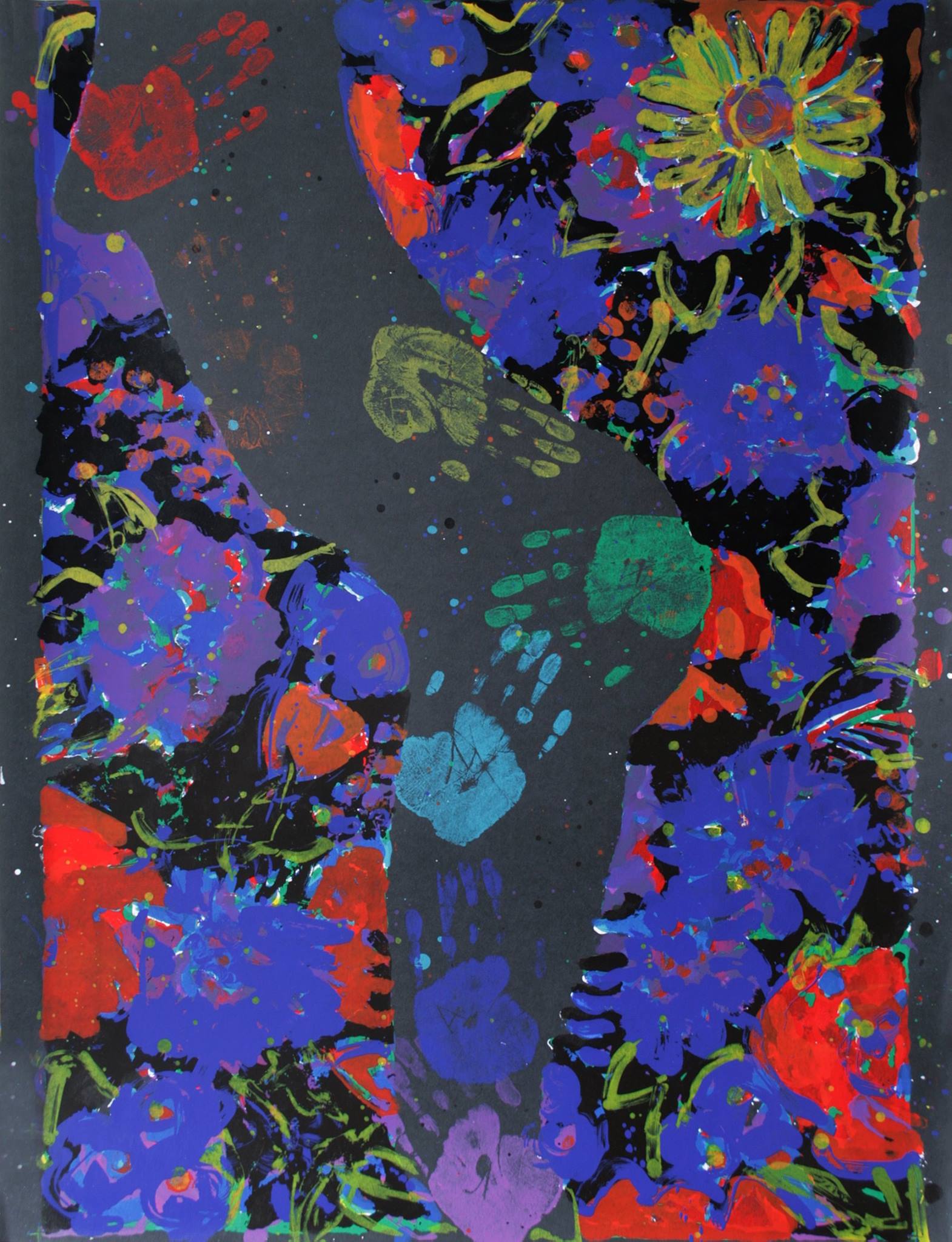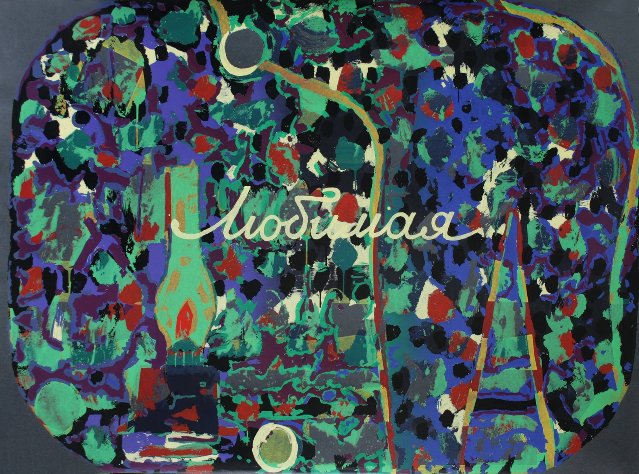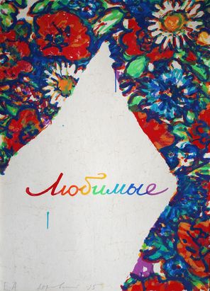 Серия была напечатана на чёрной бумаге и на белой (с теплым оттенком и чуть заметным рисунком). Печаталась одна форма в двух вариантах. На кроющих и прозрачных красках (я немного по-другому распределил работы для показа и понимания). Цветочный рисунок продолжался до Нового года. В новый год были сделаны композиции с лампой и дальнейшее развитие в сторону пуантолизма (заканчивалась прозрачная краска). Фиолетовый и красный листы это - как бы схема. 7 красок - 7 букв в слове Любимые, Любимая, Любимый, Любимое.