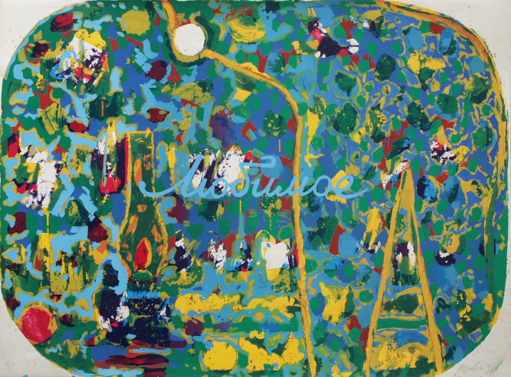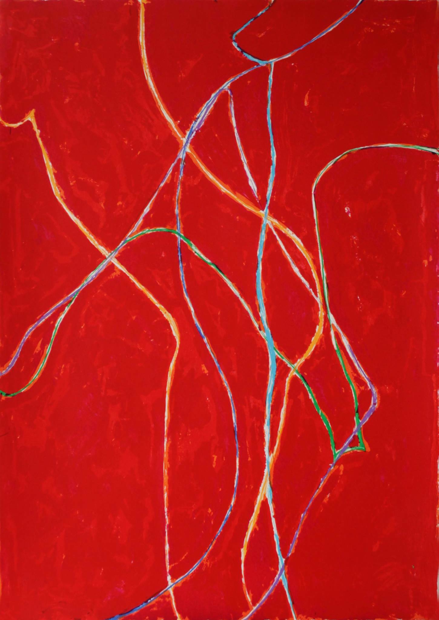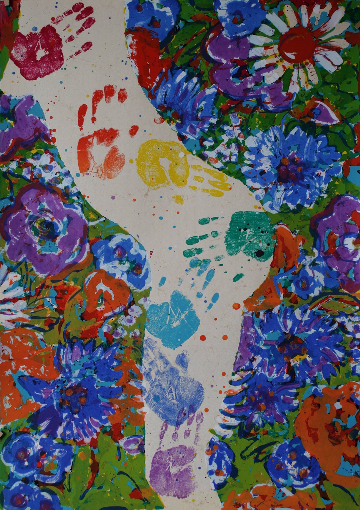 Серия была напечатана на чёрной бумаге и на белой (с теплым оттенком и чуть заметным рисунком). Печаталась одна форма в двух вариантах. На кроющих и прозрачных красках (я немного по-другому распределил работы для показа и понимания). Цветочный рисунок продолжался до Нового года. В новый год были сделаны композиции с лампой и дальнейшее развитие в сторону пуантолизма (заканчивалась прозрачная краска). Фиолетовый и красный листы это - как бы схема. 7 красок - 7 букв в слове Любимые, Любимая, Любимый, Любимое.