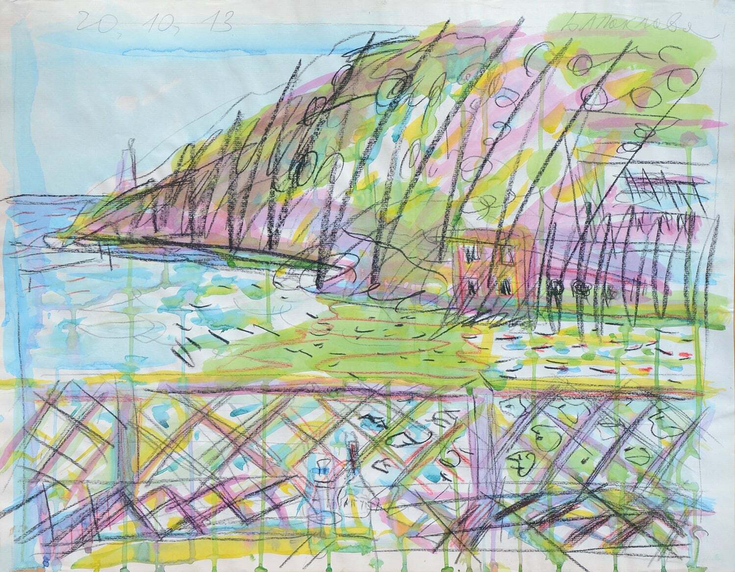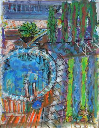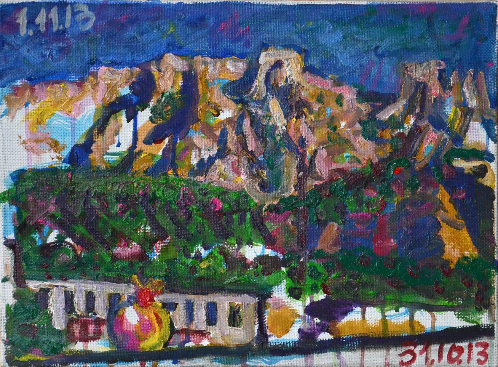 Вообще - был такой распорядок у меня: утром (до восхода солнца) ныряние в бассейн..на плите доходил мой кофе. Дальше я ждал восход солнца с чашечкой и сигаретой - рисовал. После завтрака я залезал на крышу с видом на Ай-Петри. Спустившись на этаж ниже, рисовал и писал бассейн с тополями, а вдали море. Днем возвращался на крышу (к своему натюрморту и пейзажу). И вся эта катавасия продолжалось до вечера, а то и ночи. И, кстати, когда я рисовал восход солнца приходил к бассейну попить воды кот Вася.
