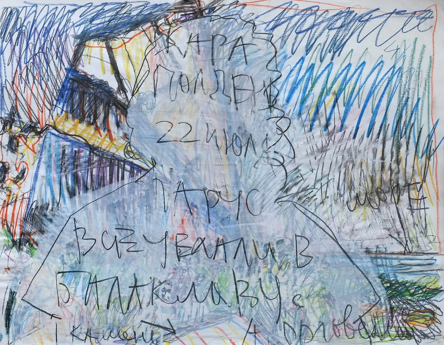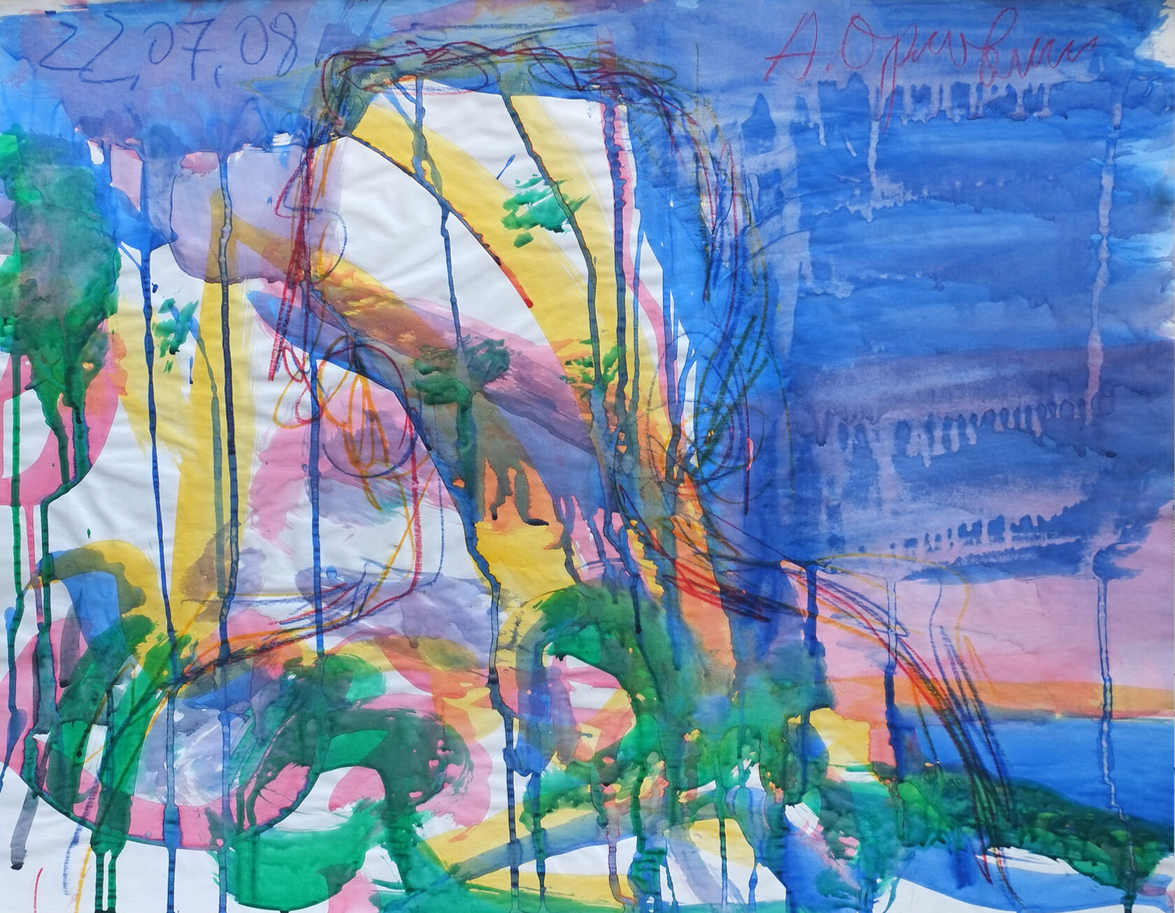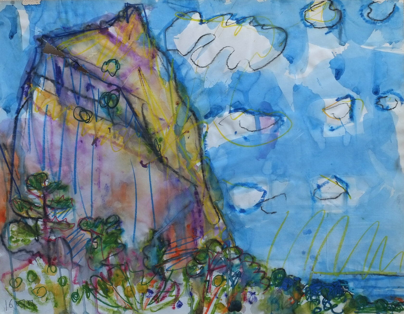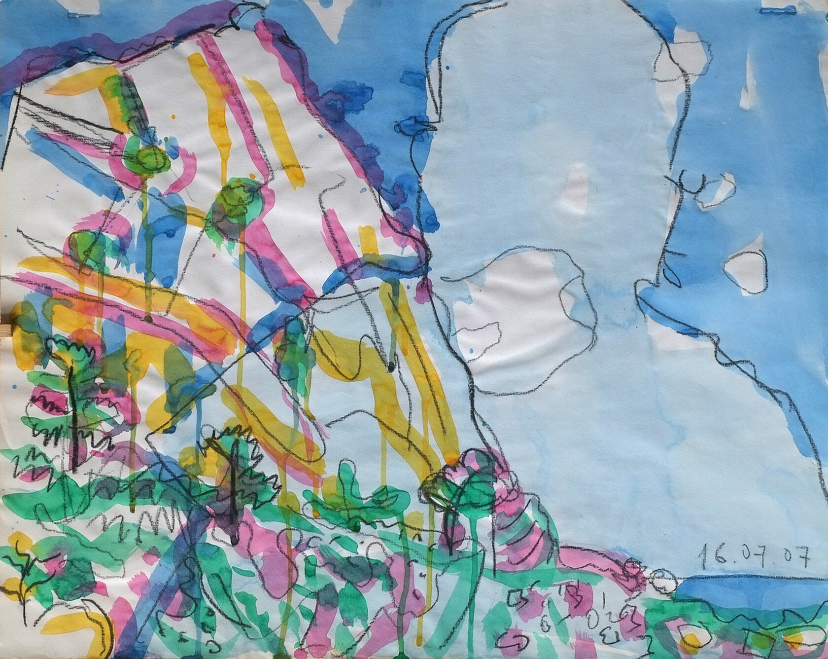 2007. Июль. Выдался довольно жарким. На краю лагеря была площадка, как бы смотровая, которая находилась на камне Мудрости. Вечерами там звучали песни под гитару, когда приезжал Андрей Дмитриевич, по моему, это как раз случилось в 2007 г. На этой площадке, когда было жарко, ребята стелили спальники и ночевали под небом, усеянным звездами. С видом на море, на котором появлялась лунная дорожка. А с противоположной стороны была гора. Днем я работал рядом с площадкой с видом на гору Парус. Стояла моя тренога, куча бумаги и пару фляг с водой, которые я наливал в 2-х минутах ходьбы, на роднике. Когда было очень жарко, я обливал себя с головой чтобы не закипеть от дневного солнца и работы. Акварель быстро сохла и можно было накладывать цвет, чередуя с карандашом. В те жаркие дни, ребята разбредались по холмам, а вечером приходили на море. На следующий год было уже не так жарко, а наоборот сыро, туман, солнце. Было интересно наблюдать с моего поста гору Парус.