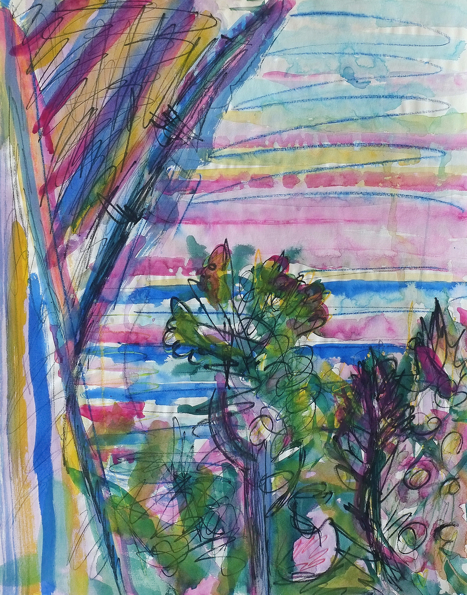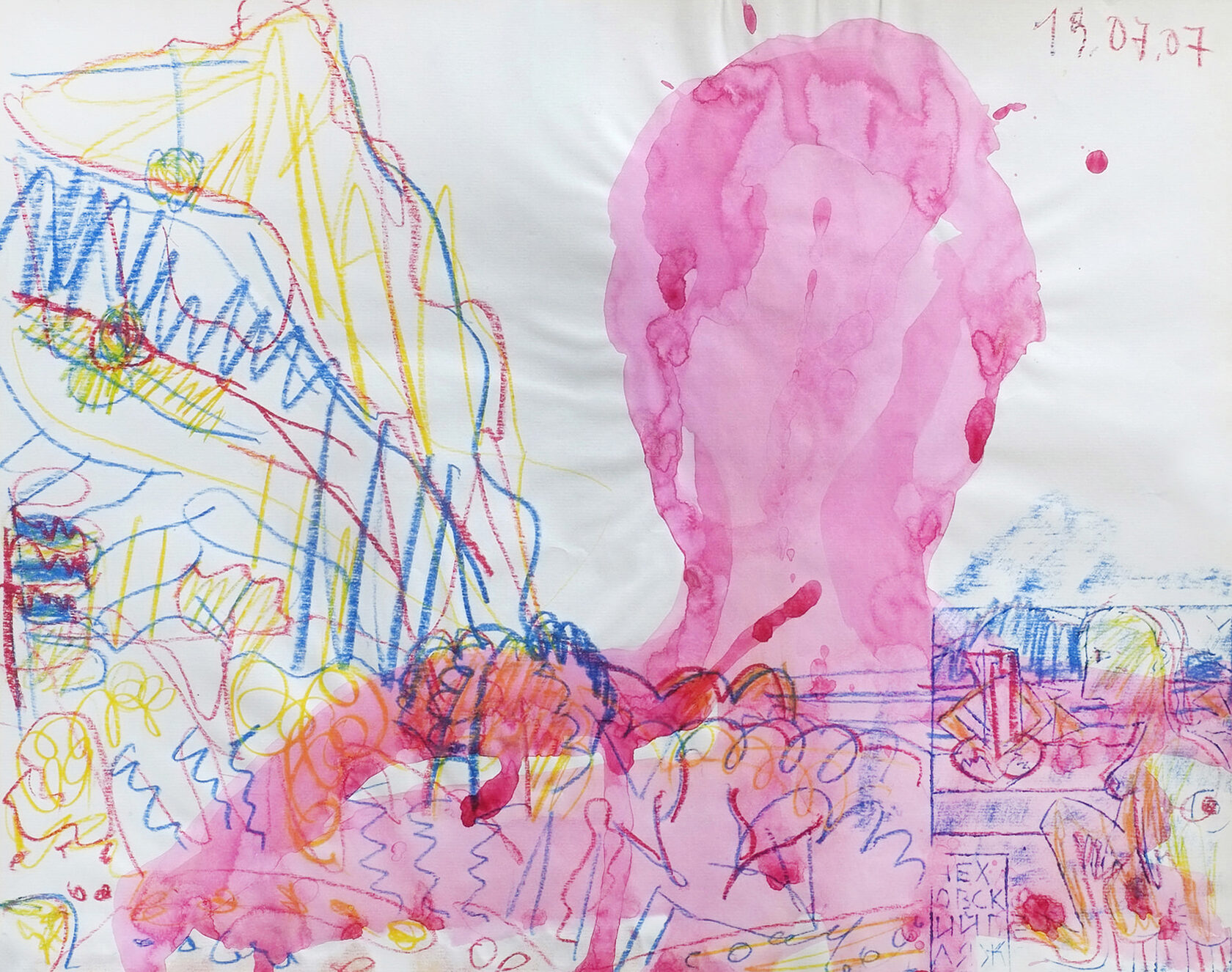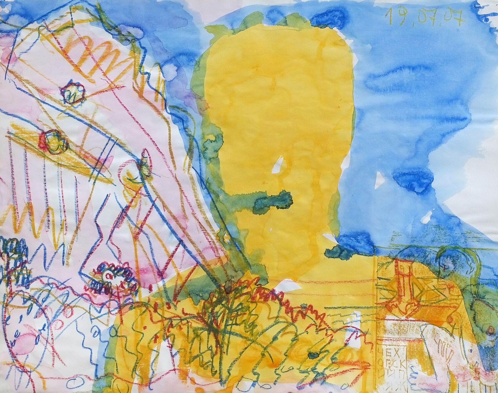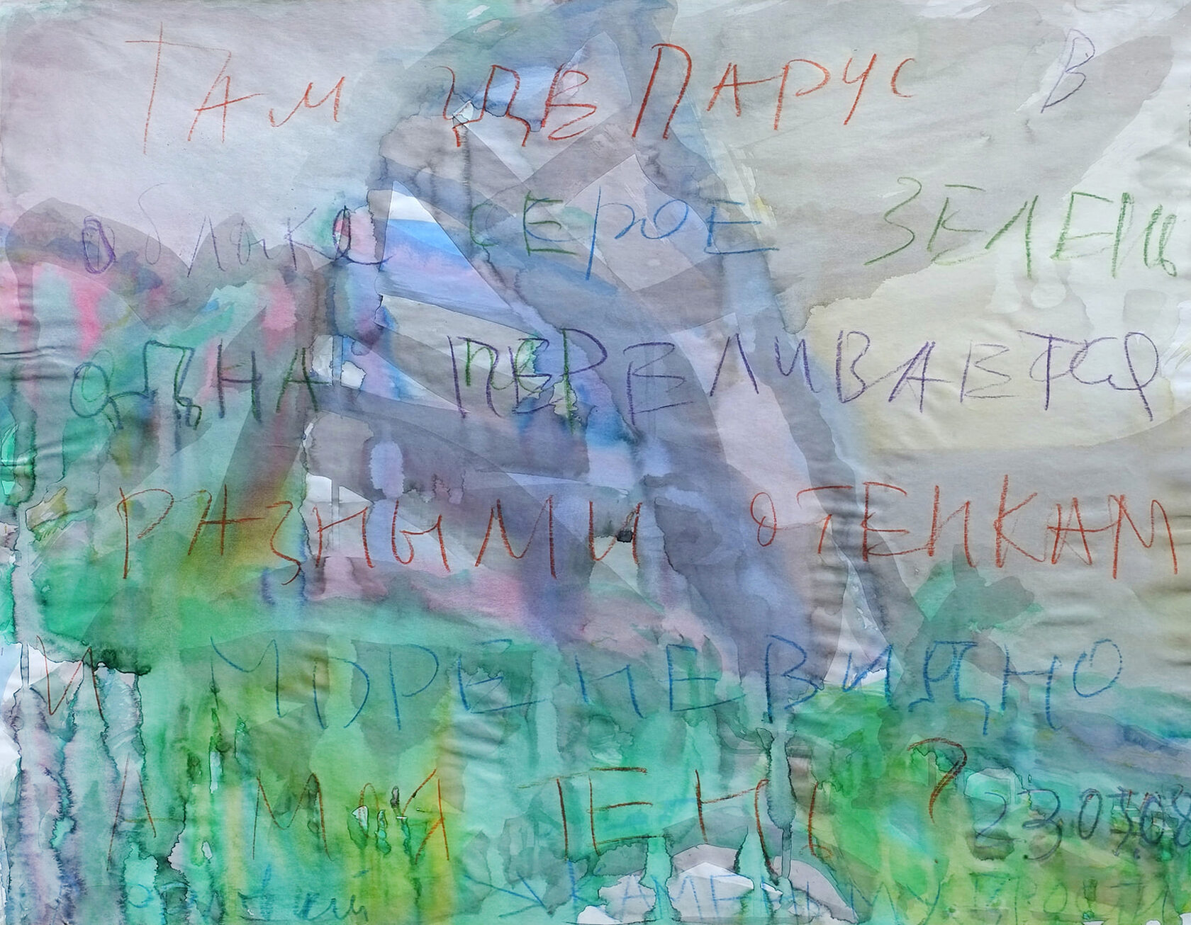 2007. Июль. Выдался довольно жарким. На краю лагеря была площадка, как бы смотровая, которая находилась на камне Мудрости. Вечерами там звучали песни под гитару, когда приезжал Андрей Дмитриевич, по моему, это как раз случилось в 2007 г. На этой площадке, когда было жарко, ребята стелили спальники и ночевали под небом, усеянным звездами. С видом на море, на котором появлялась лунная дорожка. А с противоположной стороны была гора. Днем я работал рядом с площадкой с видом на гору Парус. Стояла моя тренога, куча бумаги и пару фляг с водой, которые я наливал в 2-х минутах ходьбы, на роднике. Когда было очень жарко, я обливал себя с головой чтобы не закипеть от дневного солнца и работы. Акварель быстро сохла и можно было накладывать цвет, чередуя с карандашом. В те жаркие дни, ребята разбредались по холмам, а вечером приходили на море. На следующий год было уже не так жарко, а наоборот сыро, туман, солнце. Было интересно наблюдать с моего поста гору Парус.