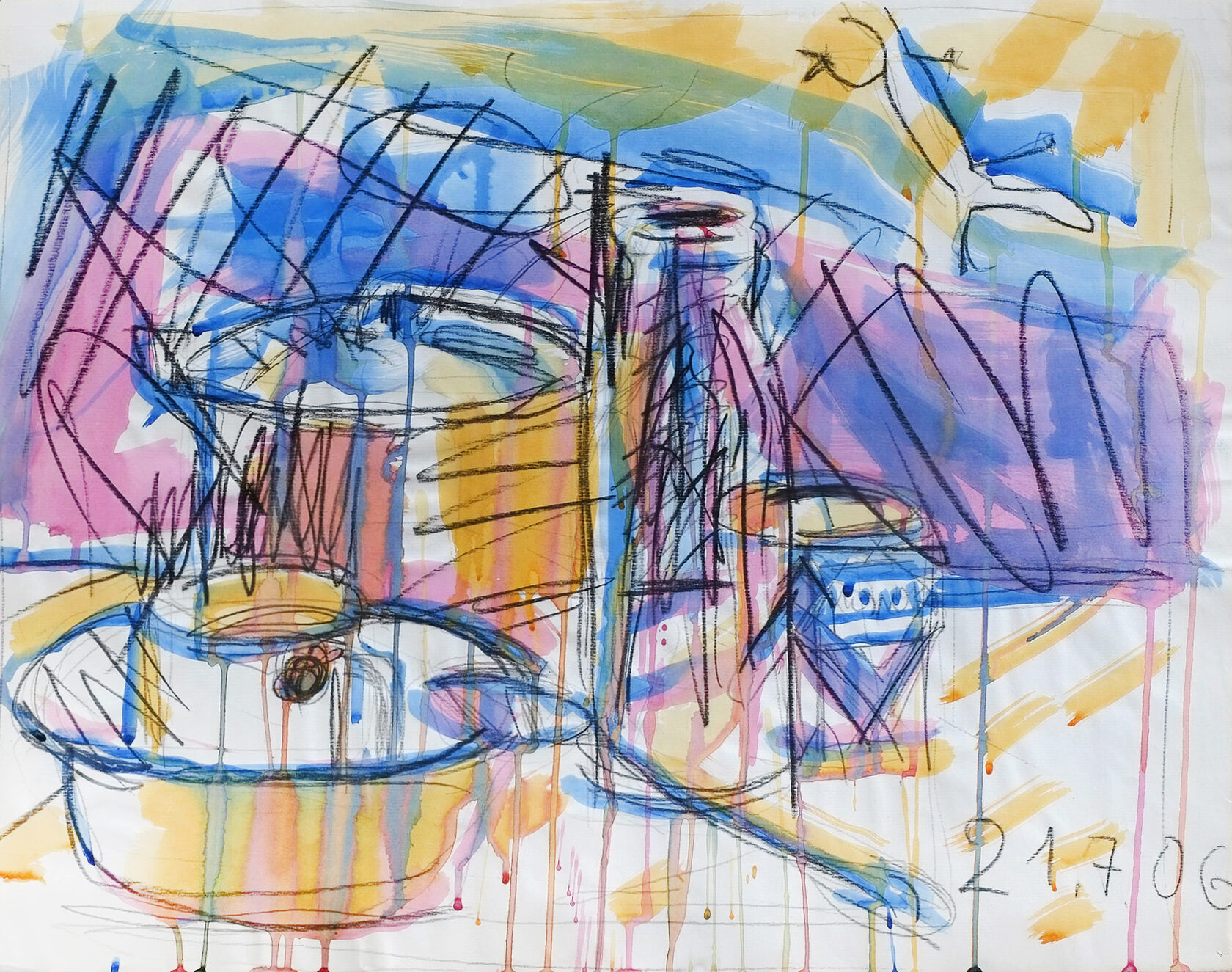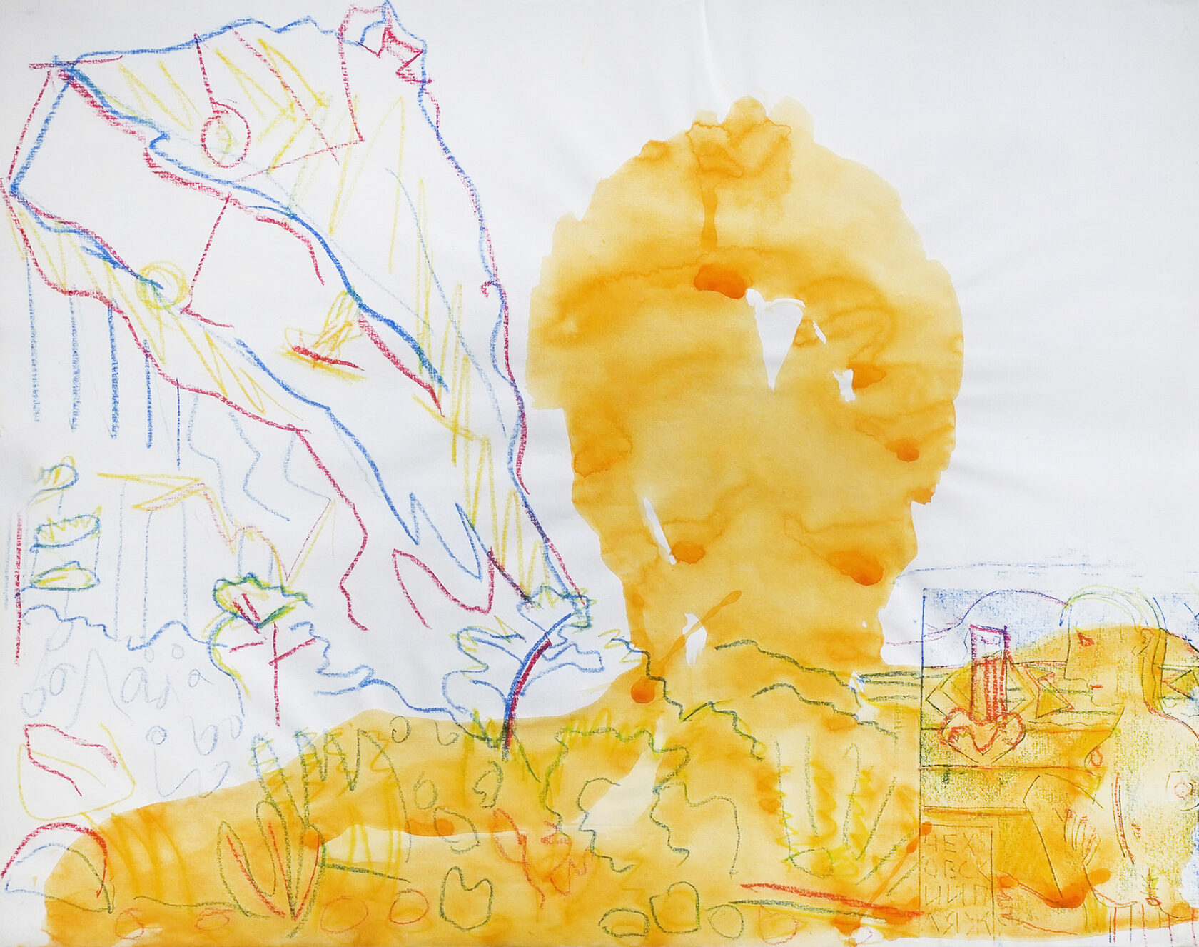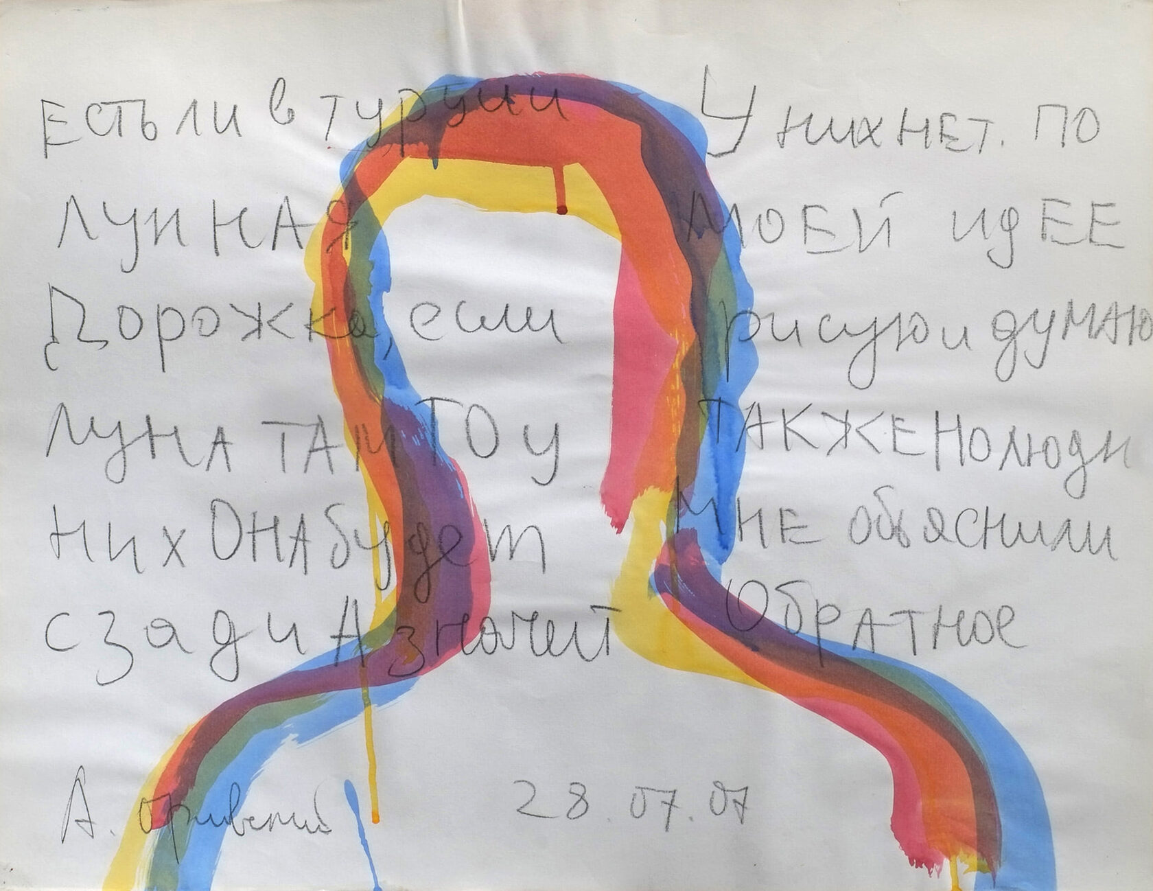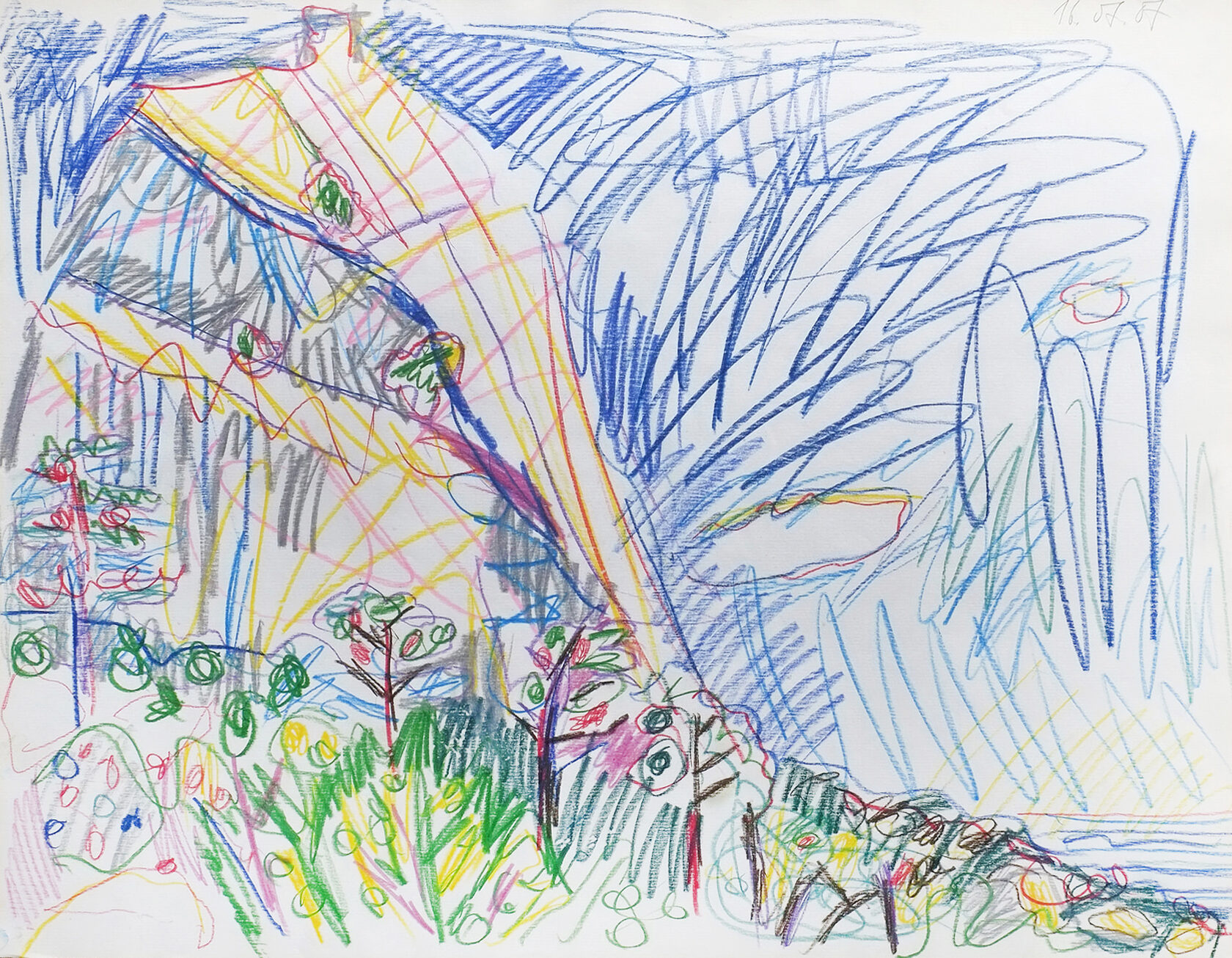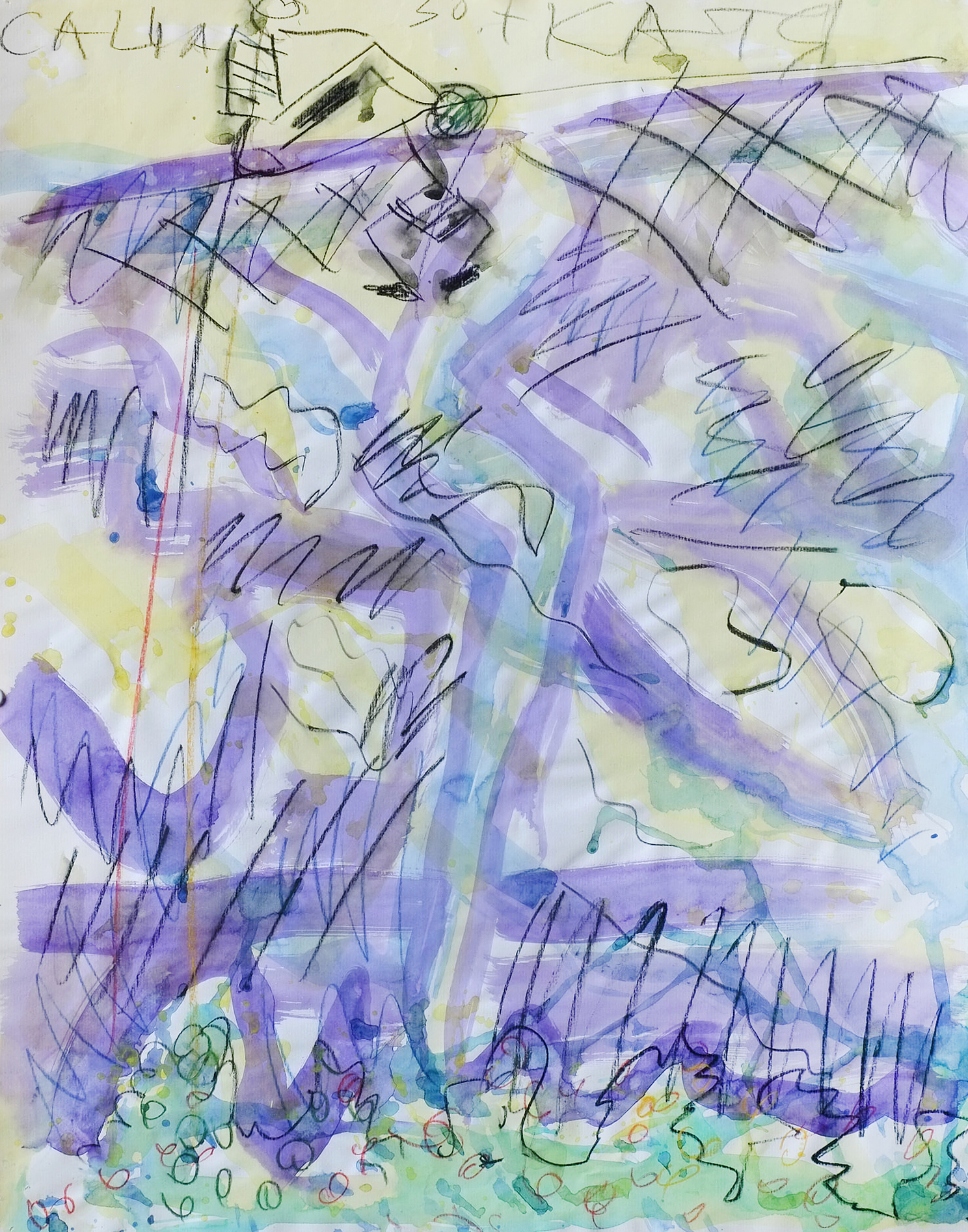 2007. Июль. Выдался довольно жарким. На краю лагеря была площадка, как бы смотровая, которая находилась на камне Мудрости. Вечерами там звучали песни под гитару, когда приезжал Андрей Дмитриевич, по моему, это как раз случилось в 2007 г. На этой площадке, когда было жарко, ребята стелили спальники и ночевали под небом, усеянным звездами. С видом на море, на котором появлялась лунная дорожка. А с противоположной стороны была гора. Днем я работал рядом с площадкой с видом на гору Парус. Стояла моя тренога, куча бумаги и пару фляг с водой, которые я наливал в 2-х минутах ходьбы, на роднике. Когда было очень жарко, я обливал себя с головой чтобы не закипеть от дневного солнца и работы. Акварель быстро сохла и можно было накладывать цвет, чередуя с карандашом. В те жаркие дни, ребята разбредались по холмам, а вечером приходили на море. На следующий год было уже не так жарко, а наоборот сыро, туман, солнце. Было интересно наблюдать с моего поста гору Парус.