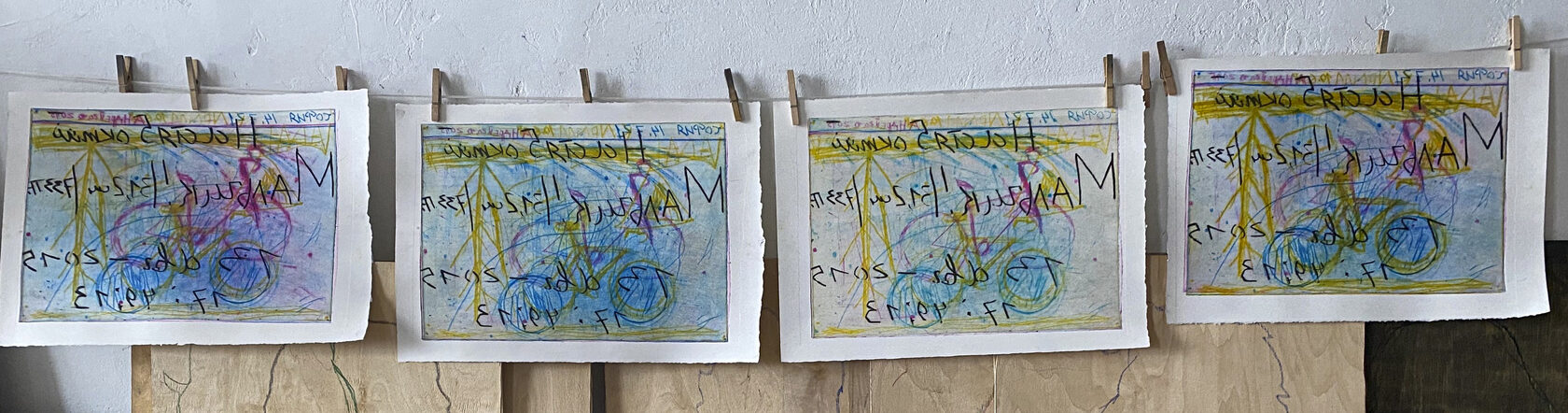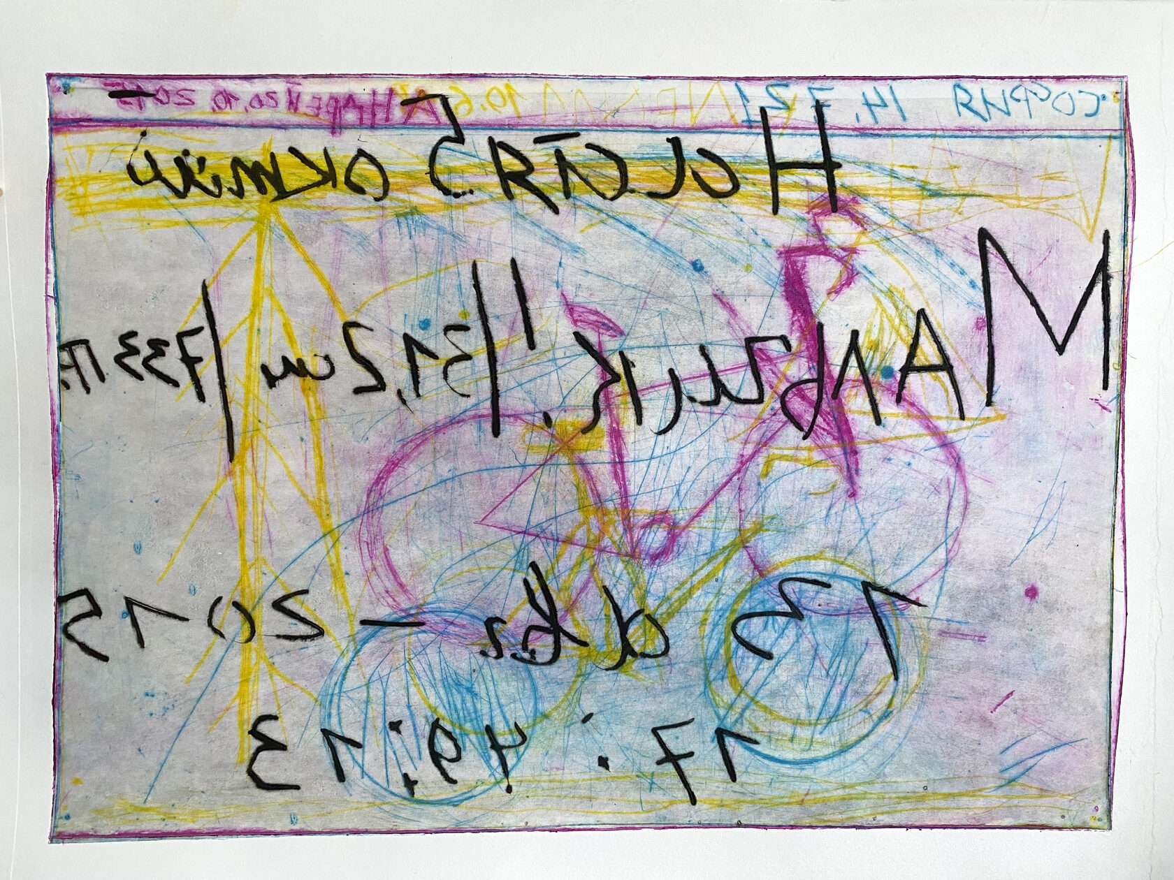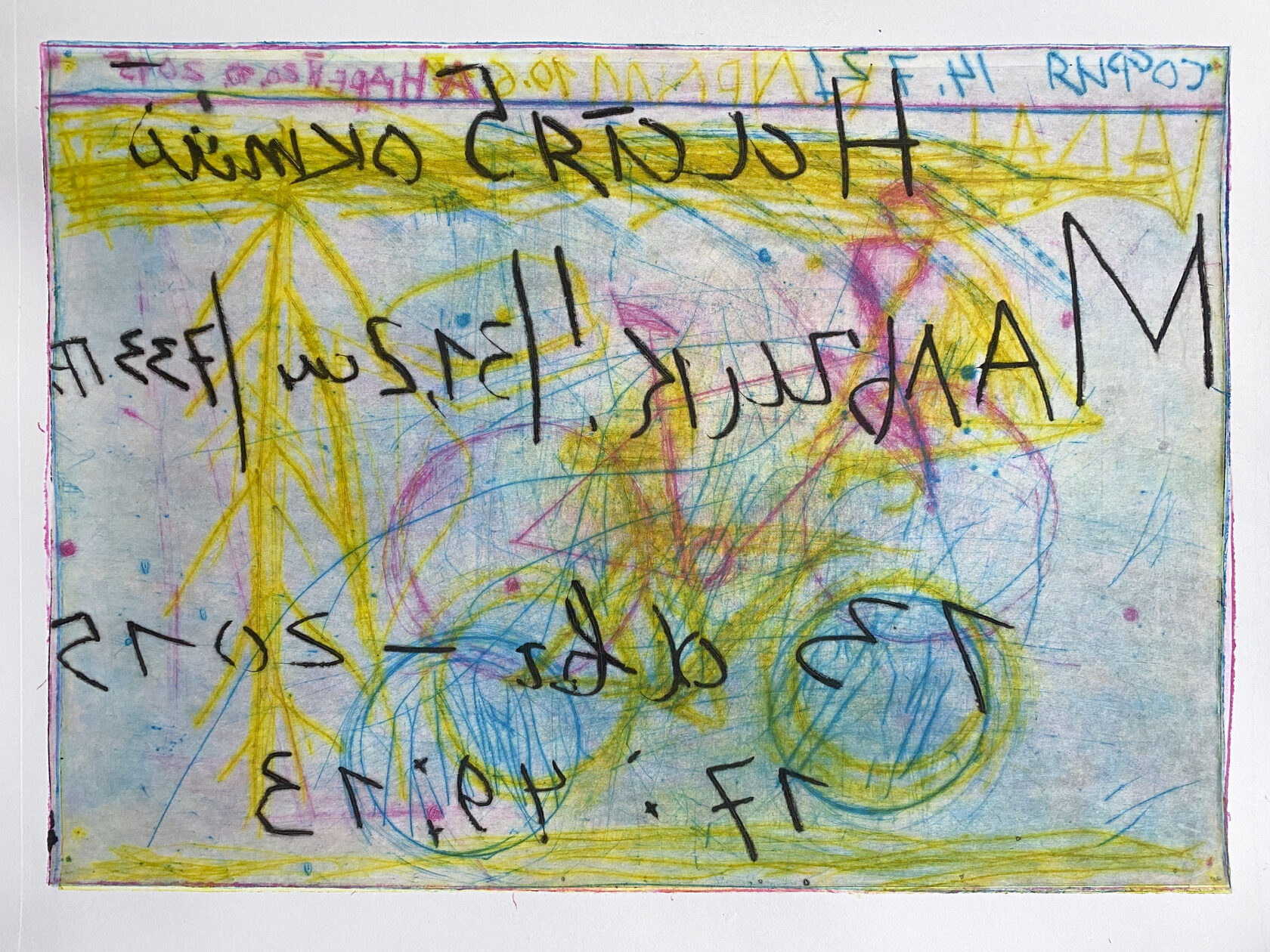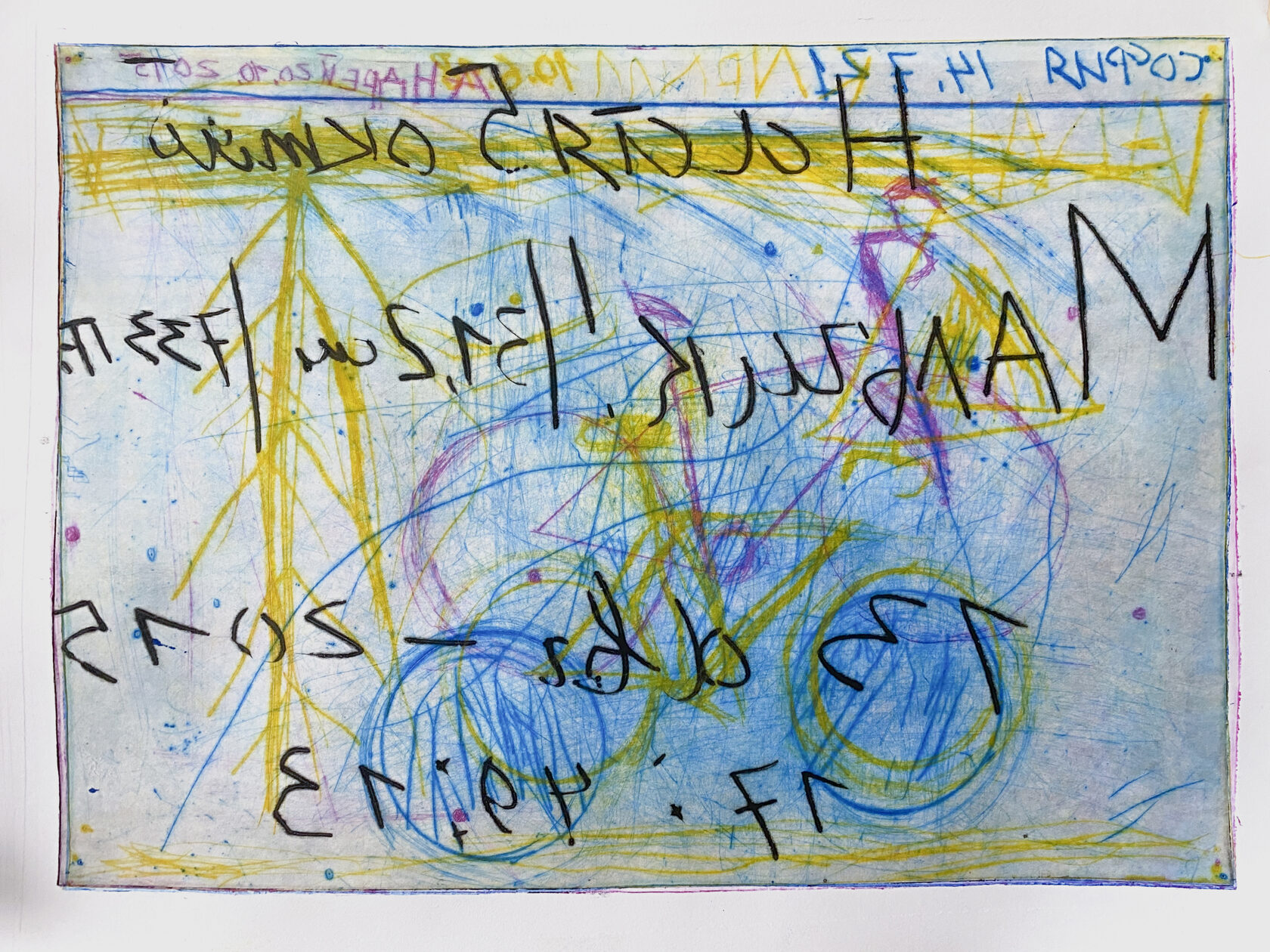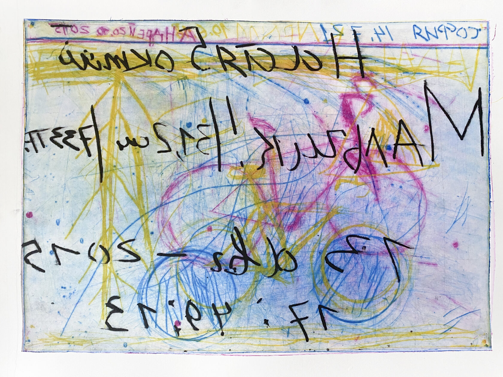 Эта серия началась в 2006–2008 году, а точнее, она сложилась в 2001–2002 году и называлась «Почта», когда обычные письма перешли в SMS. Это близкие мне люди с которыми я вел разговор. Обычно, это зеркальный текст, личная переписка, напоминающая тексты Леонардо Да Винчи. Он делал это специально, а я в печатной графике, которая имеет зеркальное отображение. Это «новое продолжение» сложилось после приглашения участвовать в выставке, посвященной 100-летию работы «Монизм вселенной» К. Э. Циолковского и выставке, которая состоится летом 2025 в Калуге. Задание к художникам было сделать три работы в любой технике и в заданном формате. Получилась серия из четырех цветных досок, которые я накладывал в разных комбинациях (желтое, красное, синее и черное).
